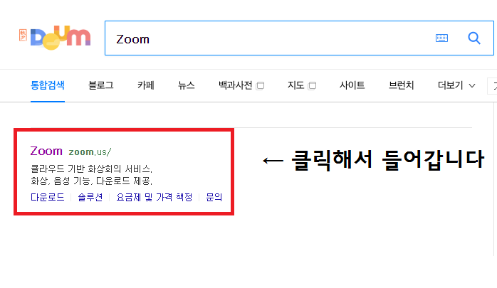 (DAUM 창에서 Zoom 다운로드 검색해도 상단에 다운로드 페이지가 뜨며, 자동 다운로드가 실행됩니다.)