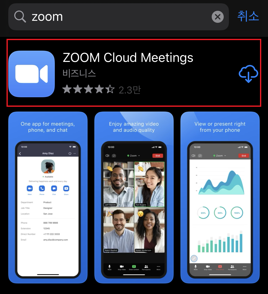 1) Google Paly 앱에서 'Zoom Cloud Meetings' 앱을 설치합니다.