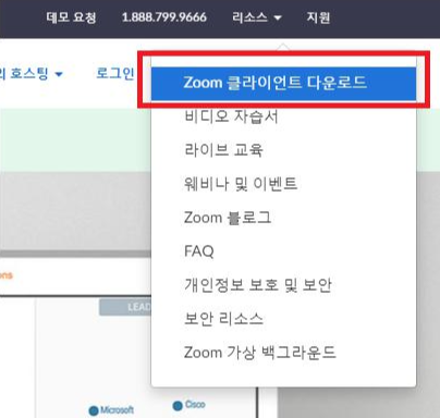 2. Zoom사이트 상단에 [리소스] > [Zoom 클라이언트 다운로드] 하기