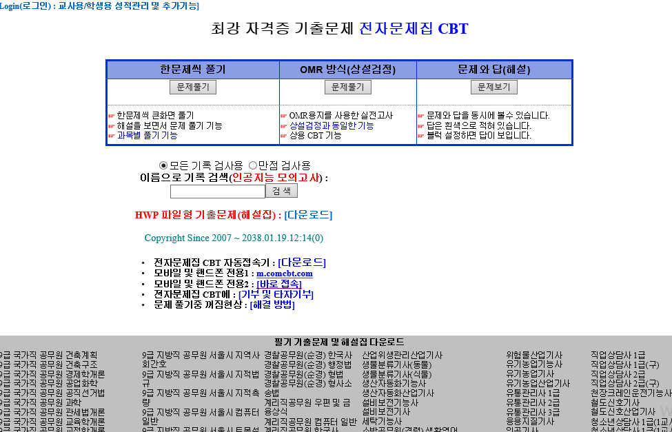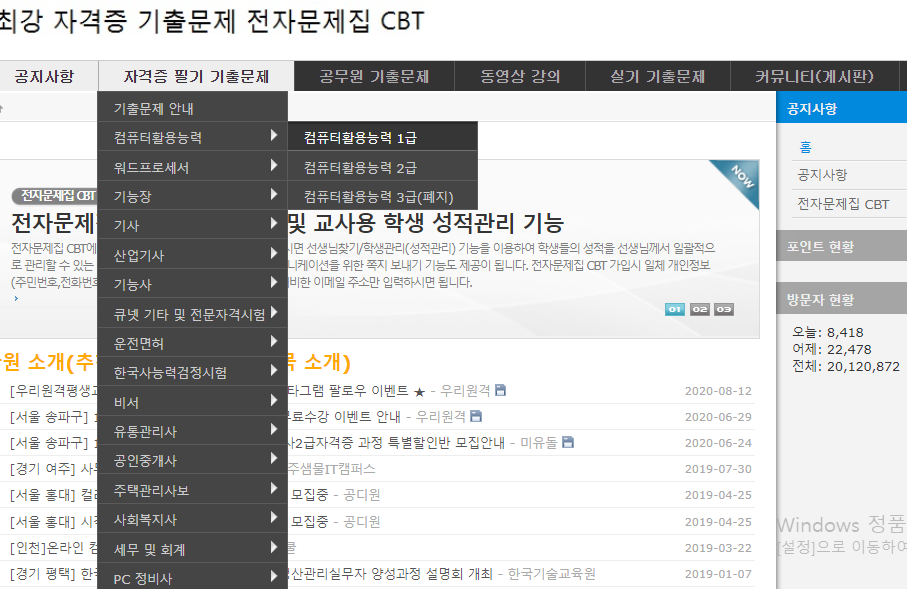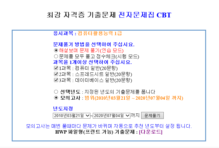 인터넷으로 문제를 풀어보는 것입니다. 컴퓨터로 모의고사, 실전 문제처럼 무료로 이용할 수 있는 사이트입니다. 실제 시험처럼 OMR 방식으로도 시험연습을 해볼 수 있어서 많은 도움이 됩니다. 과년도 기출문제를 풀어볼 수 있고 시험문제를 다운로드 받을 수도 있는 사이트입니다.