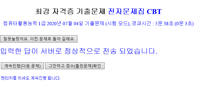 이 사이트 없었으면 다 수기로 공부해야 했겠죠? 풀이대로 점수도 볼 수 있고 공부하기에 너무 편리한 전자문제집 CBT 사이트입니다^^ 열심히 공부해서 원하는 자격증을 취득하시길 바랍니다^^