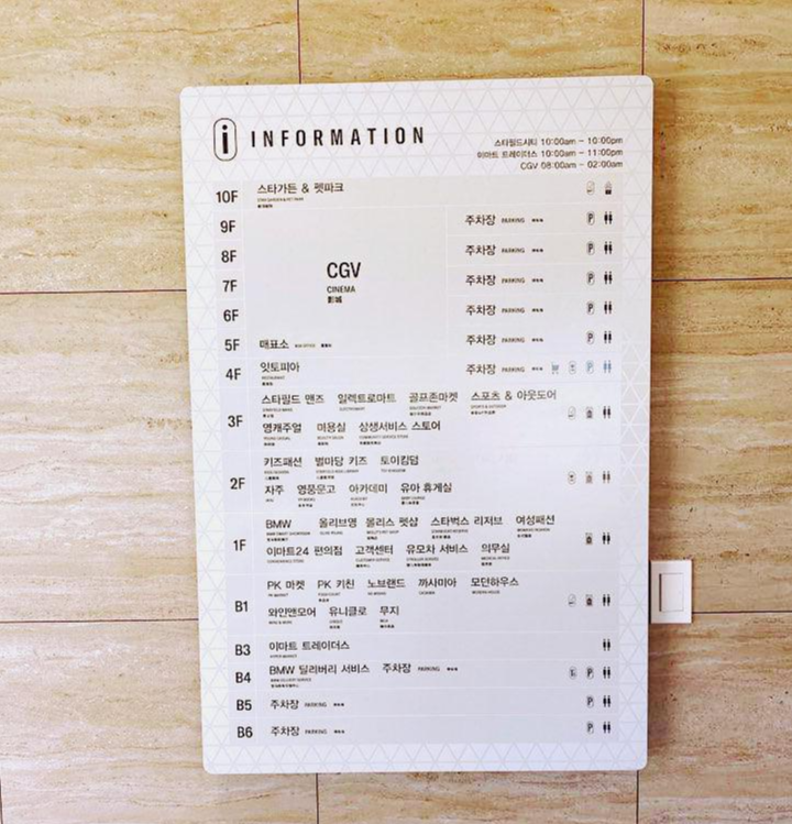 5층에는 CGV와 주차장이 있었고 5층~9층까지도 CGV와 주차장으로 되어있다고 맵에 나타나 있습니다.