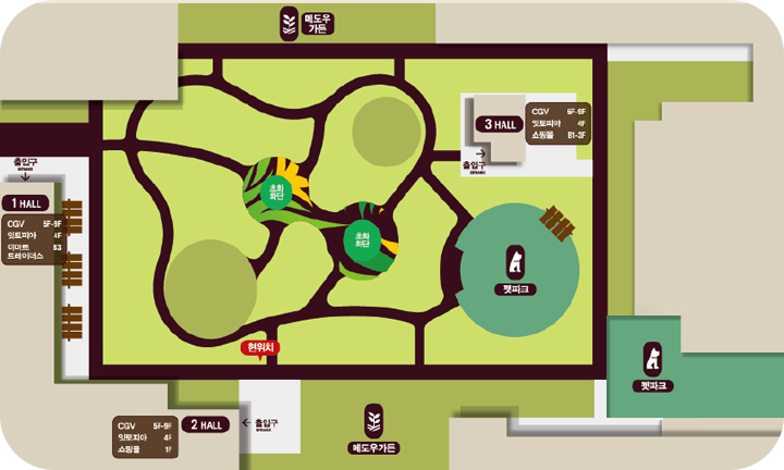 10층 – 잔디쉼터, 초화화단, 둘레길 및 산책로, 펫파크(소형견 전용 / 중·대형견 전용), 매도우가든 등의 구조로 되어있었습니다.