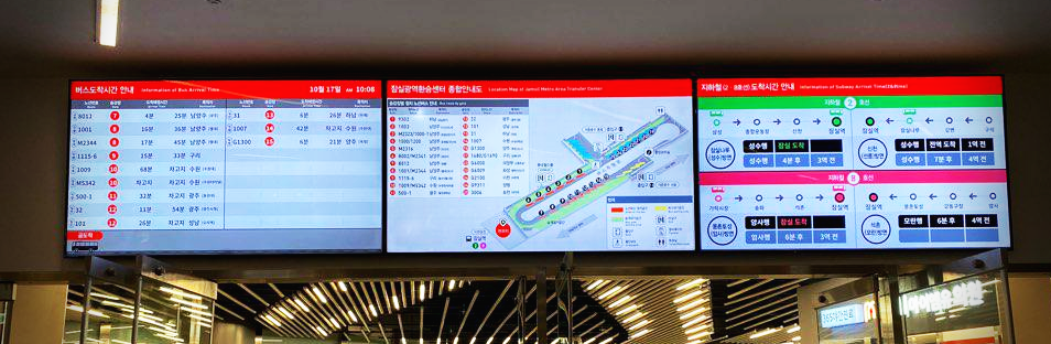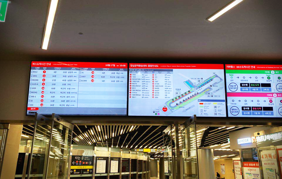 환승센터 입구에는 종합안내 스크린이 있어 도착예정시간과 버스가 전에 몇정류장 전에 있는 지 버스 운행 정보를 제공하고 있습니다.