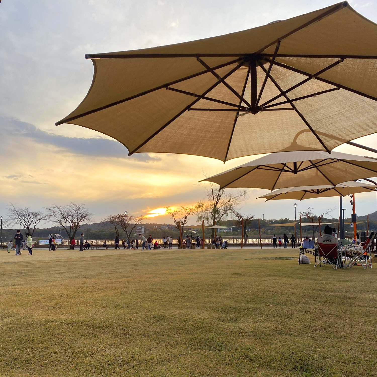 이곳에는 야외무대도 있어 뒤쪽에 햇빛을 가릴 수 있는 곳도 있고 돗자리를 펴서 앉을 수 있는 잔디밭도 있어요.