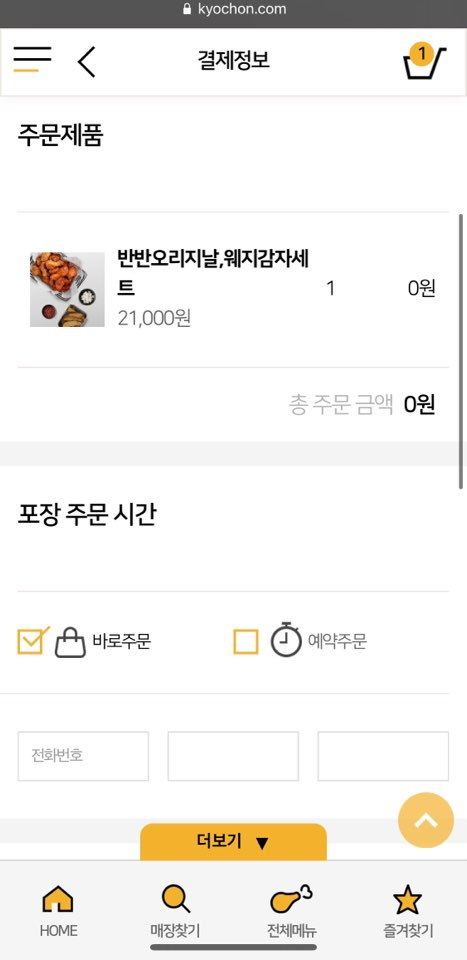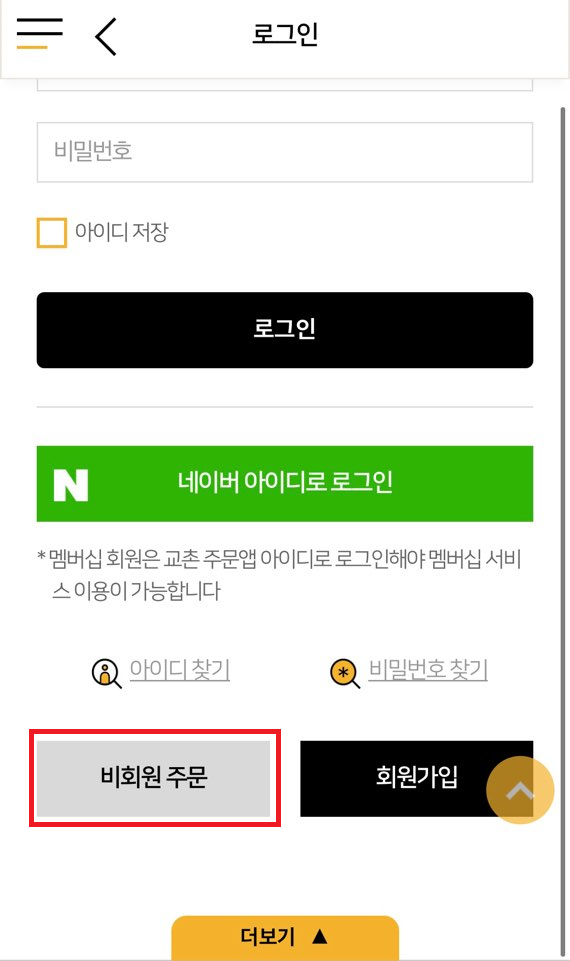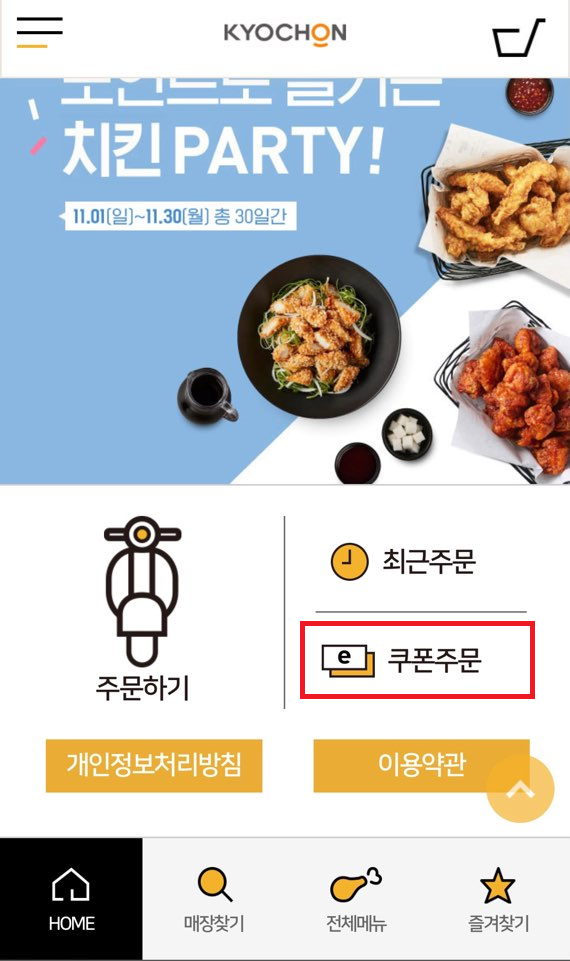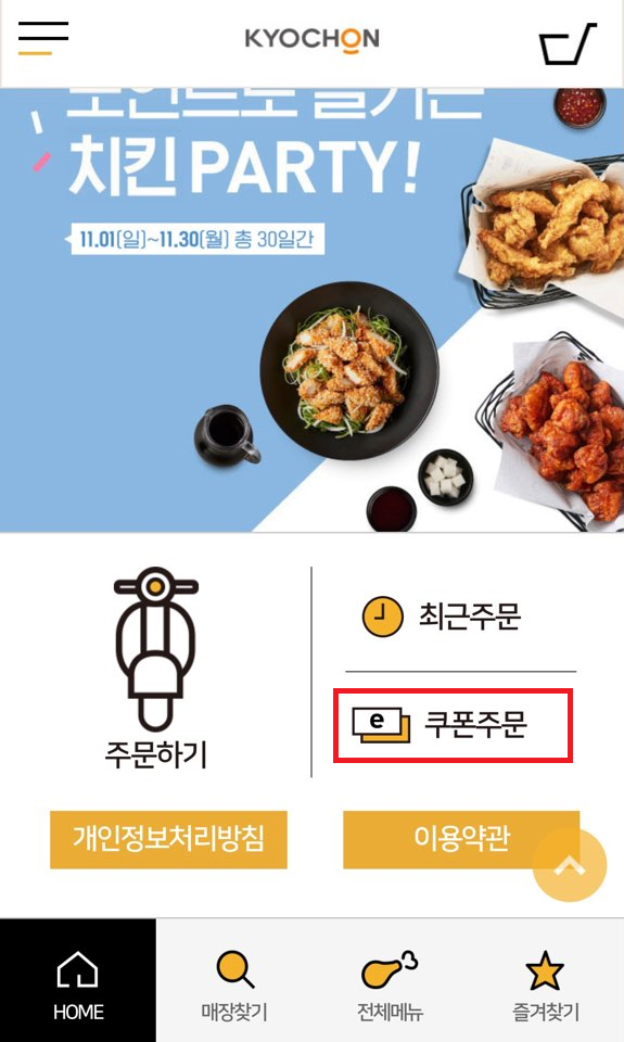 모바일에서 어플이나 교촌치킨 홈페이지에 접속합니다.