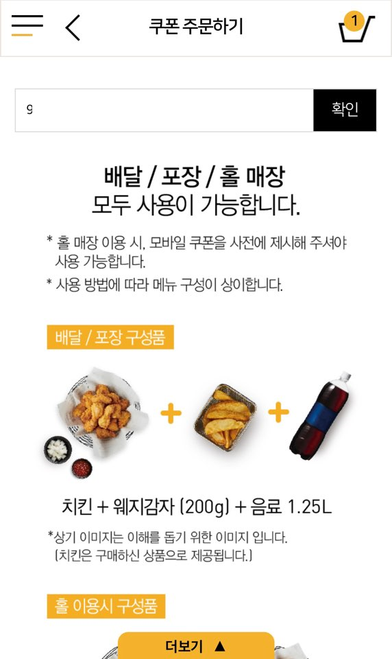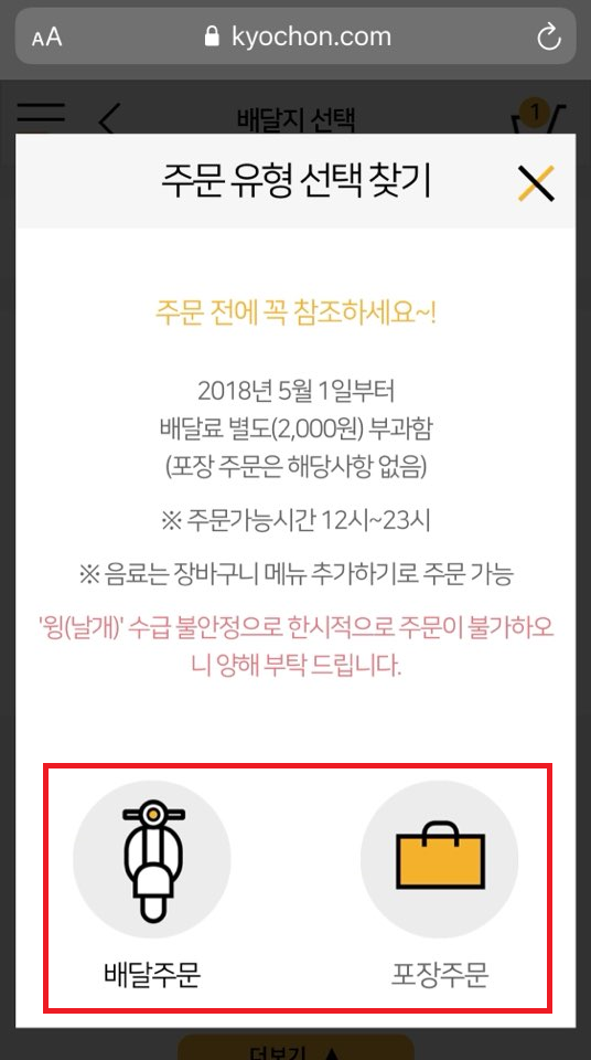 쿠폰으로 주문하려면 주문유형 선택을 할 수 있었는데요. 배달주문/포장주문으로 나뉩니다.