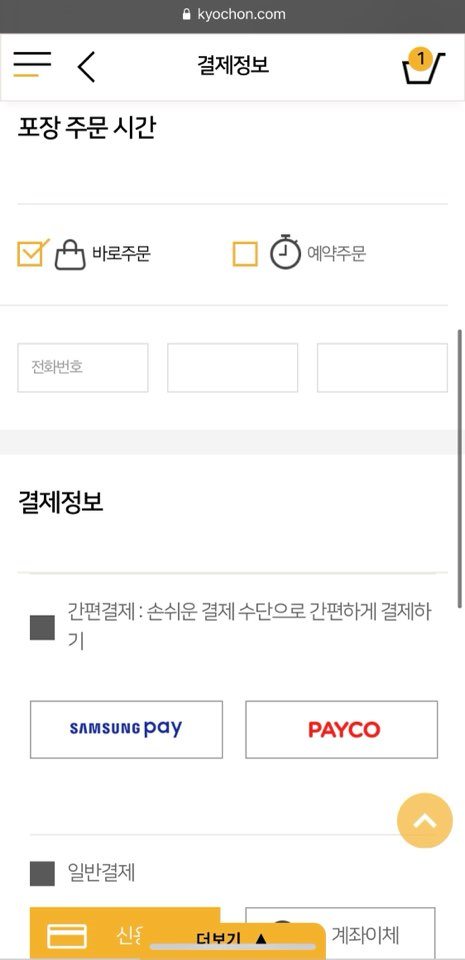 원하는 주문 유형을 선택한 후에 결제할 때 매장정보를 확인하고, 전화번호도 입력합니다.