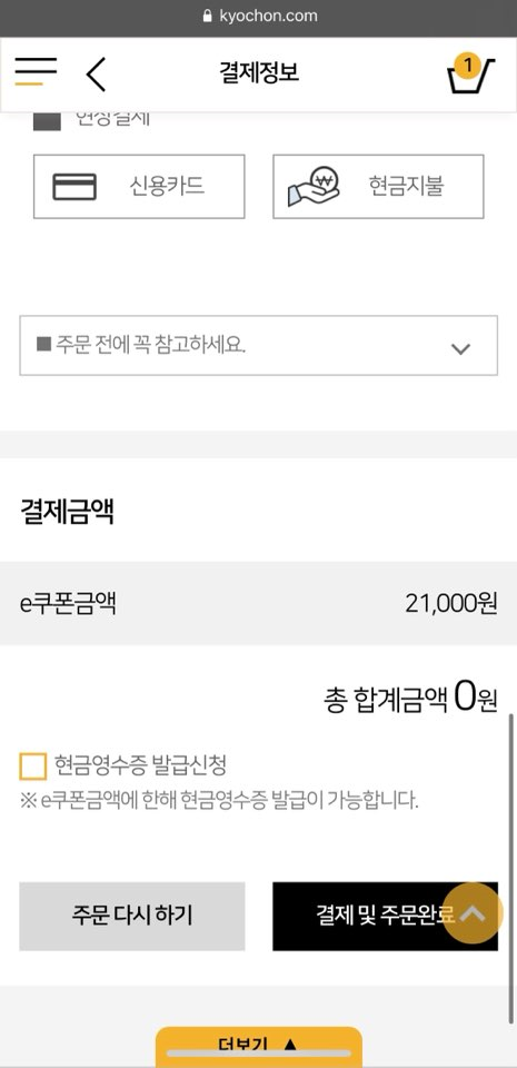 쿠폰결제를 하게 되면 결제금액에 e쿠폰금액이 0원으로 뜹니다. 현금영수증도 발급할 수 있습니다.
