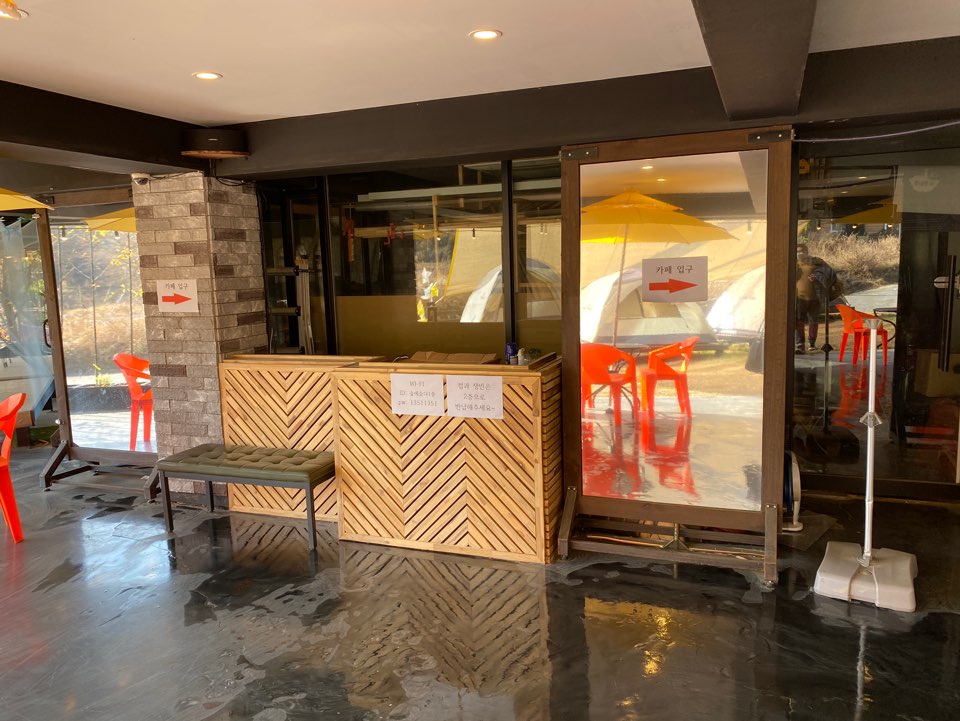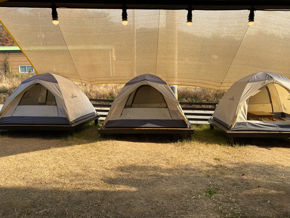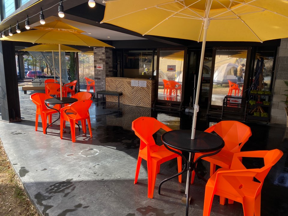 카페는 1층에 텐트가 있고 주문할 수 있는 2층 공간에도 테이블이 있고요. 3층에도 테라스와 앉을 수 있는 테이블이 있답니다. 잠시 들렀다 가보는 것도 좋아요.