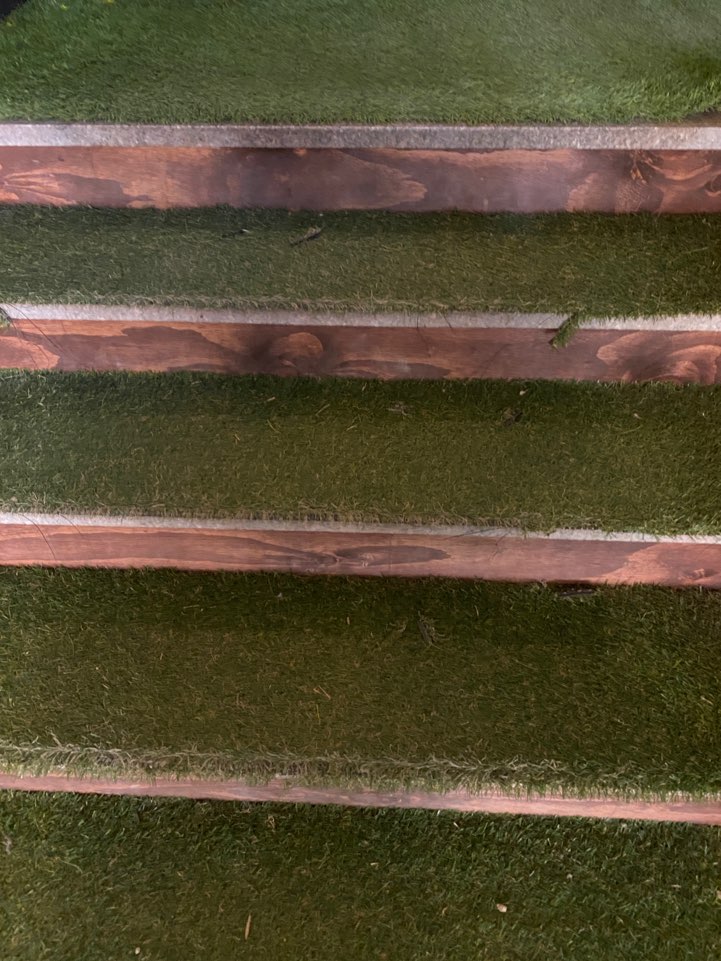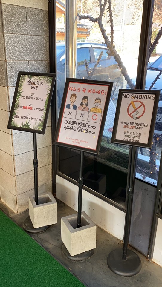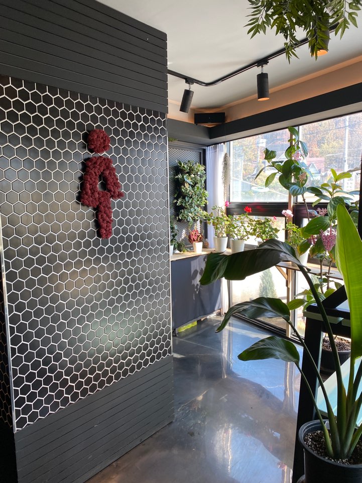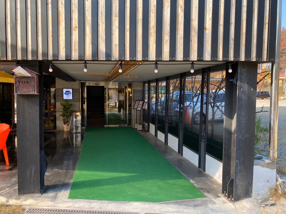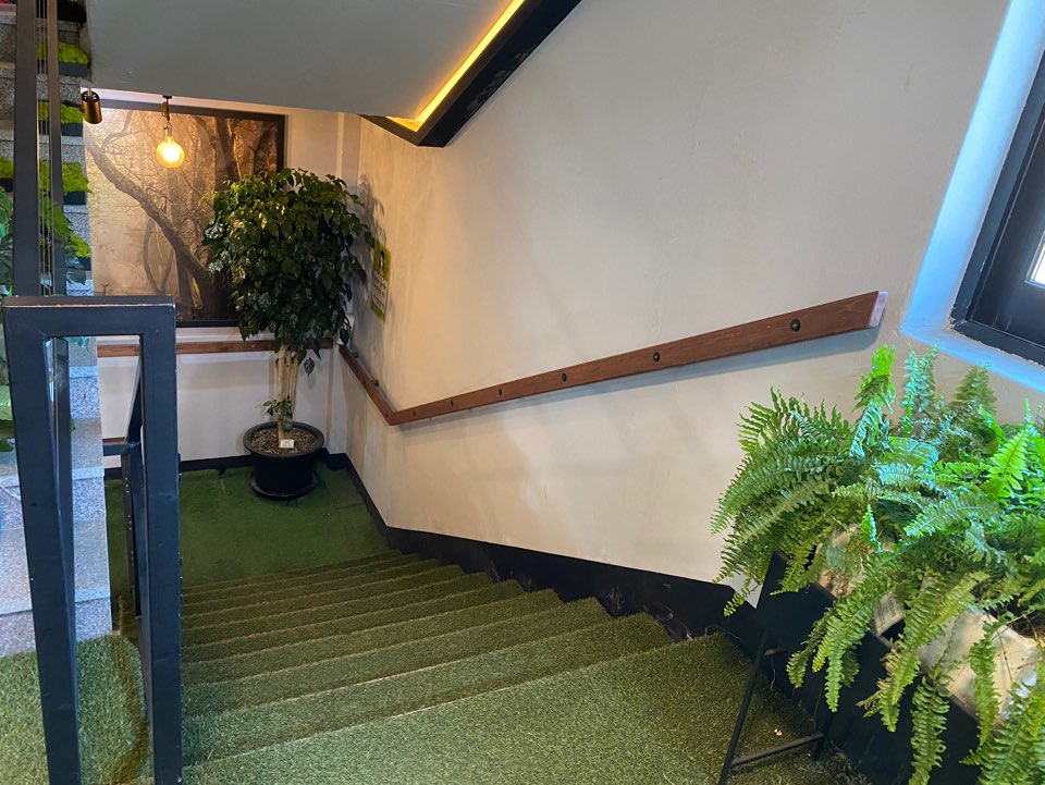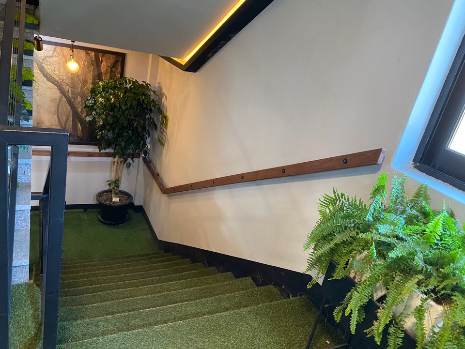 카페 건물과 1층의 풍경들입니다. 1층에도 앉을 수 있는 공간이 있습니다. 카페 입구 안내문을 따라 들어갑니다. 가는 계단에도 인조 잔디 같은 것들로 꾸며져 있었습니다.