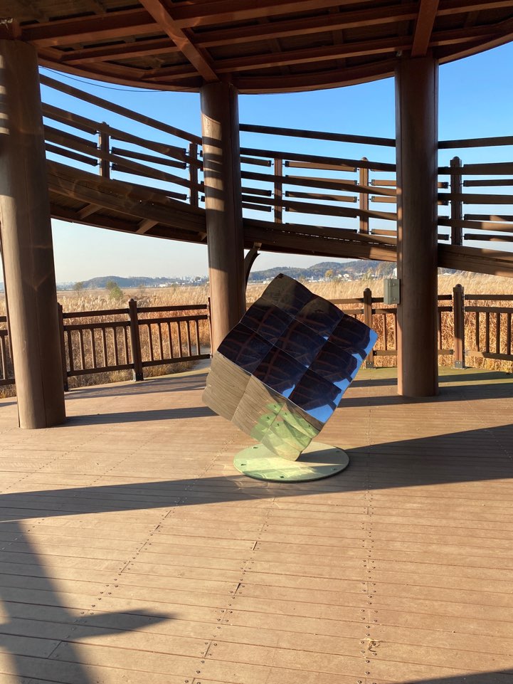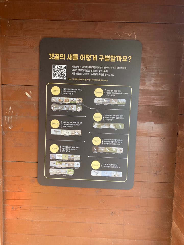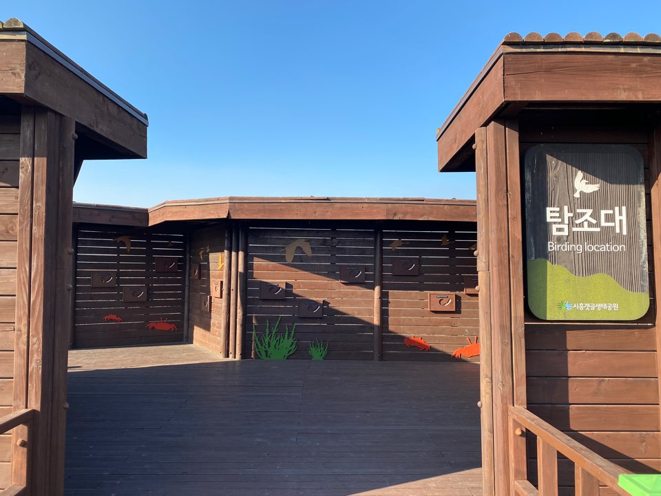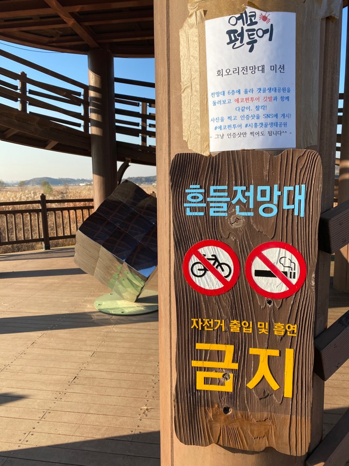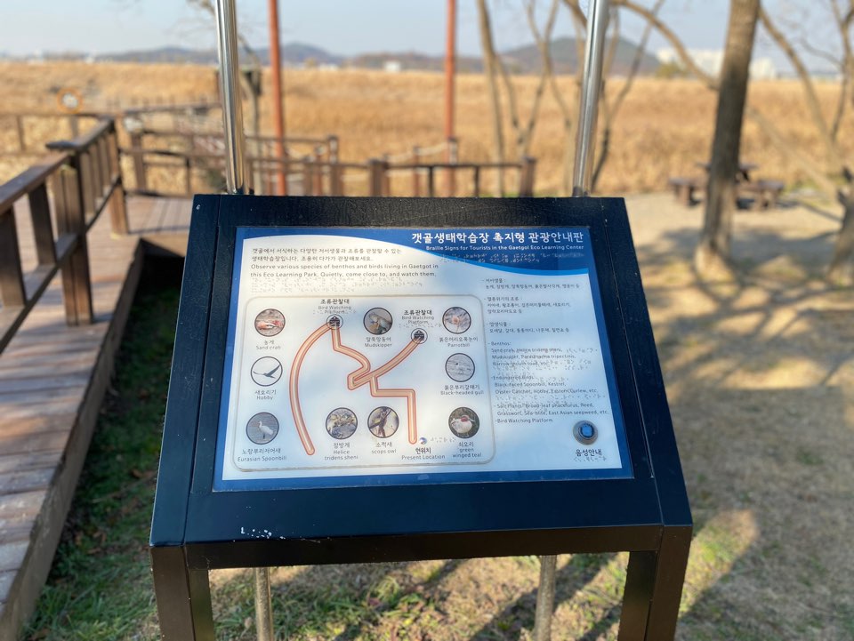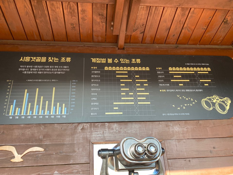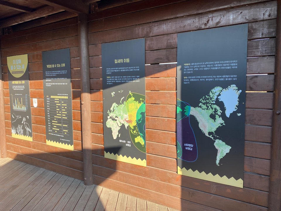 갯벌습지보호지역입니다. 데크 길을 따라 쭉 걸어보니 조류를 관찰할 수 있다는 표지판이 있었습니다. 안에서 관찰할 수 있는 망원경 시설도 있었습니다. 비록 오리와 강밖에 안보이긴 했습니다. 탐조대도 있고 자연을 학습할 수 있는 장같아요.