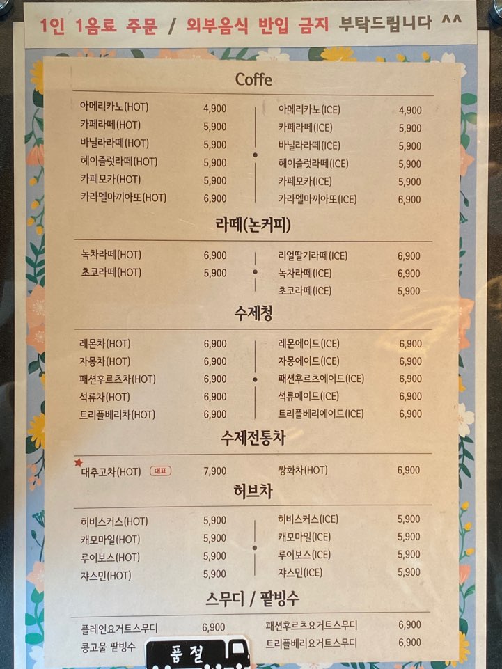 2층에 카페 주문하려고 들어와보았습니다. 1인 1메뉴라고 합니다. 음료는 기본적으로 1인 1메뉴이죠~