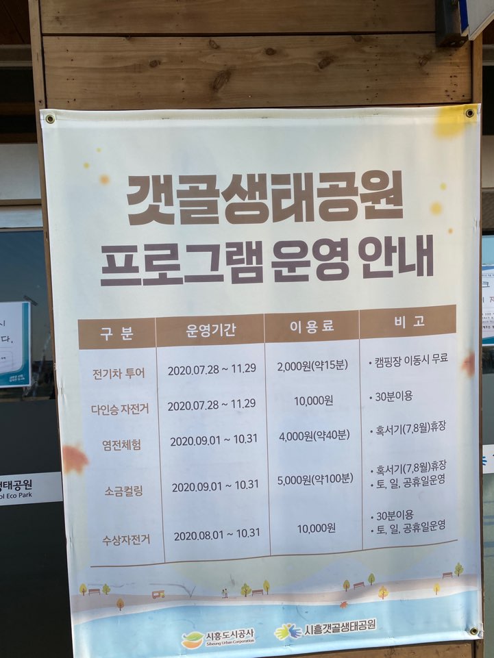 갯골생태공원의 프로그램을 운영하고 있다는 안내문이 있었습니다. 초입에는 화장실도 있었고요. 자전거도 대여할 수 있던데 자전거를 이용하시는 분들도 있더라고요. 다음연도에 선선할 때 와서 자전거 대여하며 주위를 둘러보는 것도 좋을 것 같았어요.