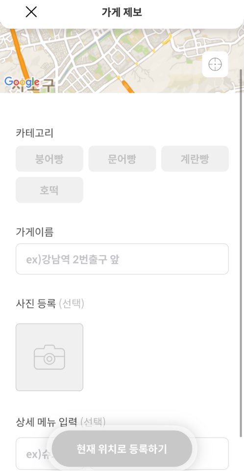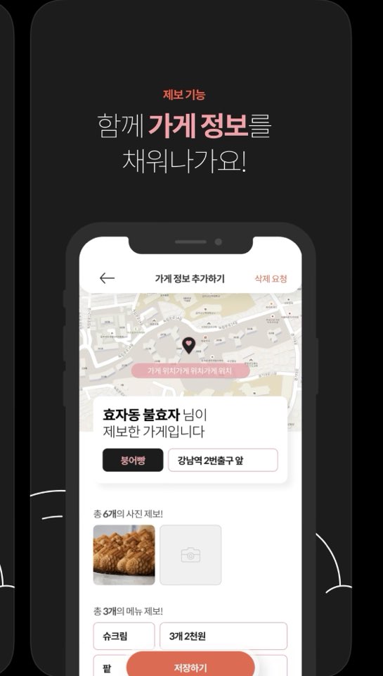 어플은 붕어빵이 먹고 싶을 때, 겨울철 호떡이 먹고 싶을 때 가게를 찾는 어플입니다. 문어빵, 계란빵도 찾을 수 있는데요. 아직 다른 메뉴들은 많지가 않습니다. 내가 아는 가게 정보를 공유할 수도 있습니다.