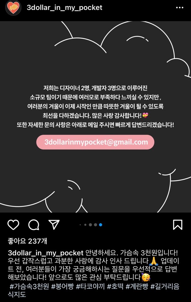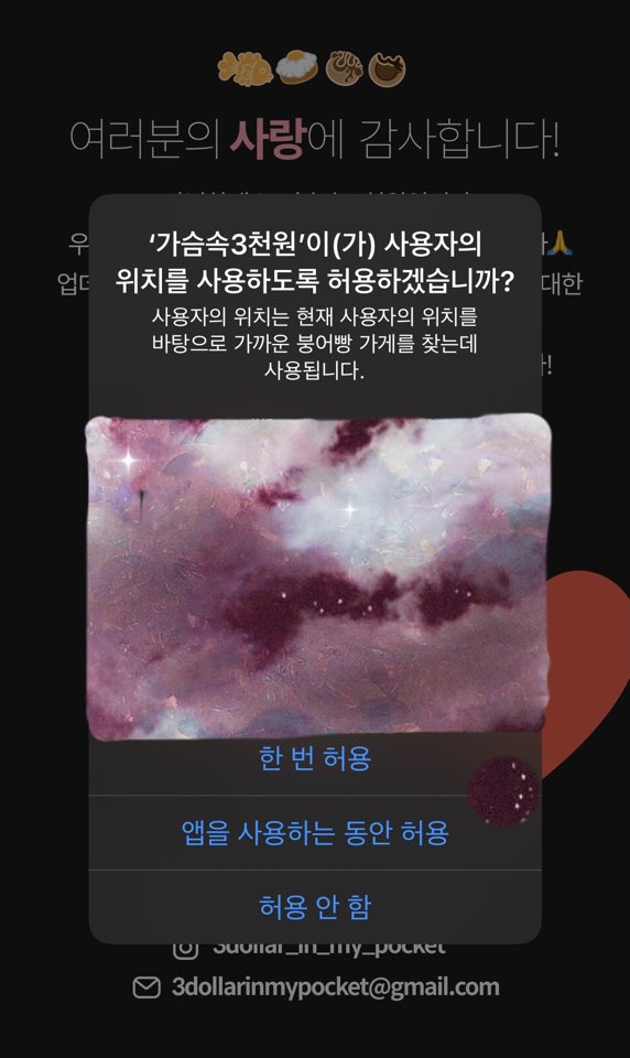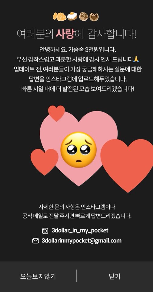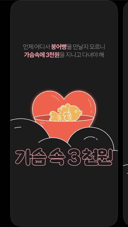 바로 어플이름은 “가슴속 3천원”입니다. 지금 당장 3천 원이 있다면 현금으로 길거리 간식을 사먹을 수 있다는 의미로 지은 앱 이름인 것 같아요.