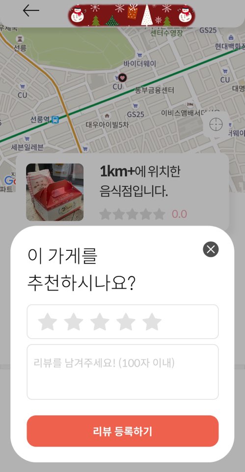 로그인을 한 후에 앱을 사용하는 동안 위치 허용을 눌렀더니 위치한 곳 근처에서 가게를 찾을 수 있는 지도가 나왔습니다.
