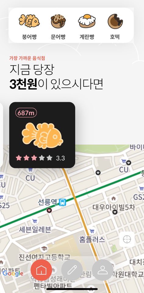 아직 이런저런 장치와 다양한 메뉴가 많이 마련된 것은 아니지만 붕어빵을 지나가다 눈에 보였을 때 사 먹는 게 아니라 그때그때 어느 위치에 가게가 있는지 확인해서 살 수 있기에 참 편리한 어플로 쓰일 것 같습니다. 이 어플을 사용하는 사람들만 붕어빵 알림 같은 게 있어도 좋을 것 같단 생각을 해봤습니다.