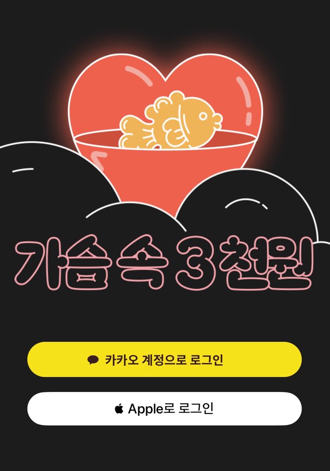 "가슴속 3천원" 어플은 설치한 후 카카오계정이나 애플아이디로 로그인할 수 있습니다. 간단하게 닉네임 입력하시면 돼요.