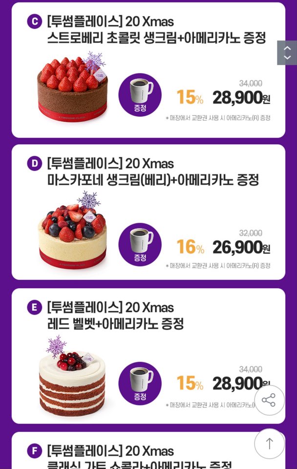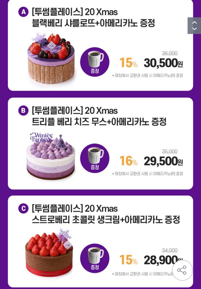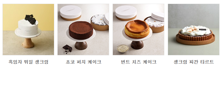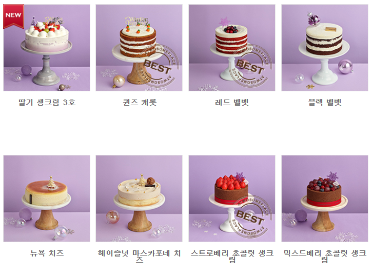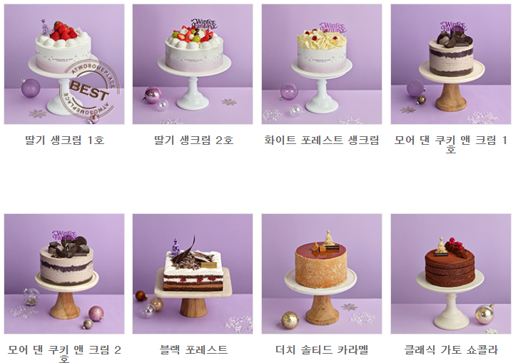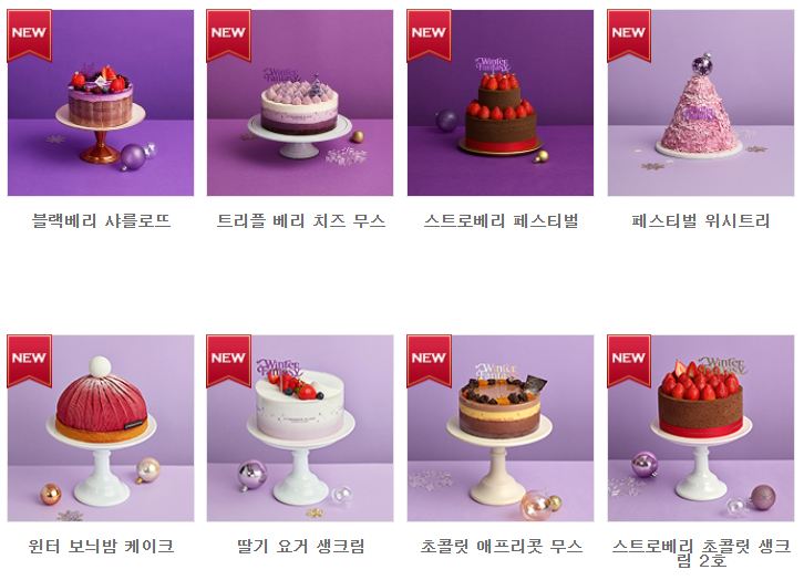 크리스마스 케이크 종류는 트리플베리치즈무스, 블랙베리 샤를로뜨, 스트로베리 페스티벌, 윈터보늬밤케이크, 페스티벌 위시트리, 딸기요거생크림 케이크가 신메뉴로 나왔습니다.
