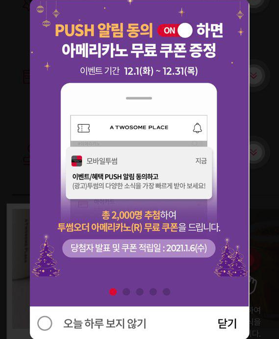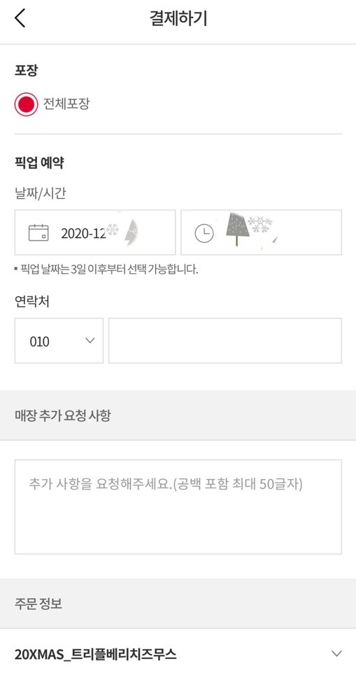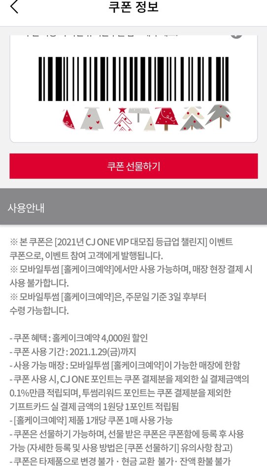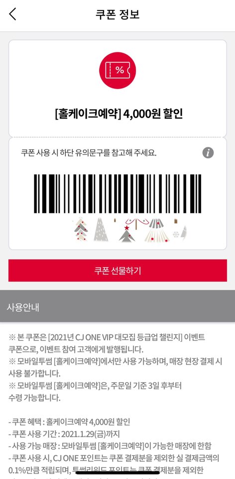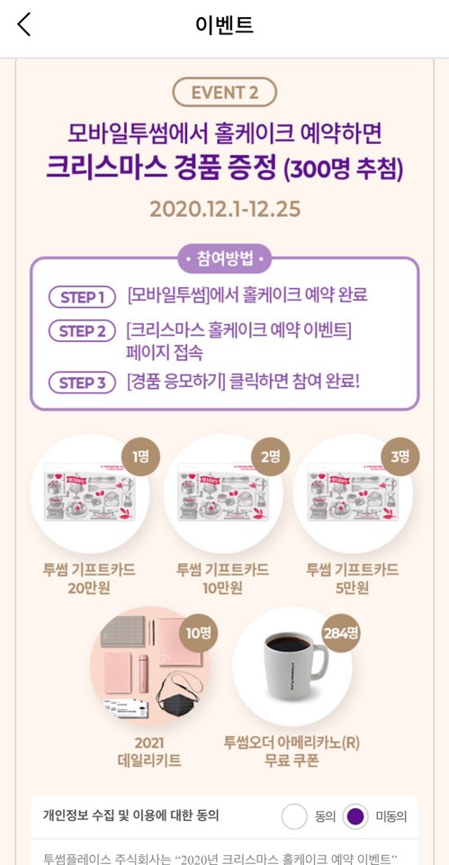 + 모바일 투썸에서 홀케이크를 예약하면 크리스마스 경품도 증정한다고 합니다. 300명 추첨한다고 하니 경품 응모하기도 클릭하면 참여 완료된다고 합니다.