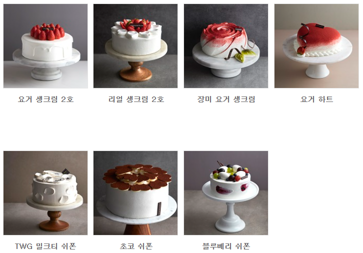스트로베리 페스티벌 케이크가 45,000원으로 되어있고, 페스티벌 위시트리 39,000원, 트리플베리치즈무스 35,000원, 블랙베리 샤를로뜨 36,000원, 스트로베리 초콜릿 생크림 34,000원, 딸기생크림 29,000원으로 전체적인 케이크 가격대는 대략 29,000원~45,000원 정도로 보시면 됩니다.