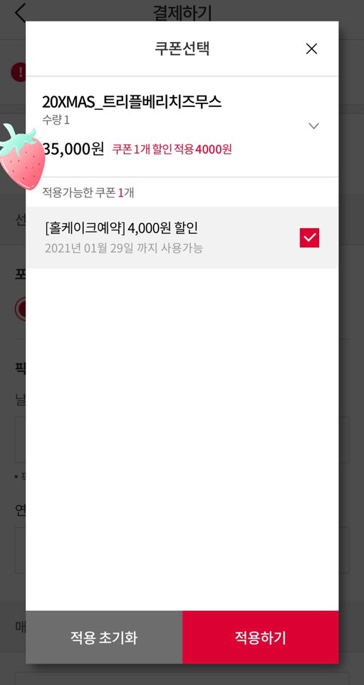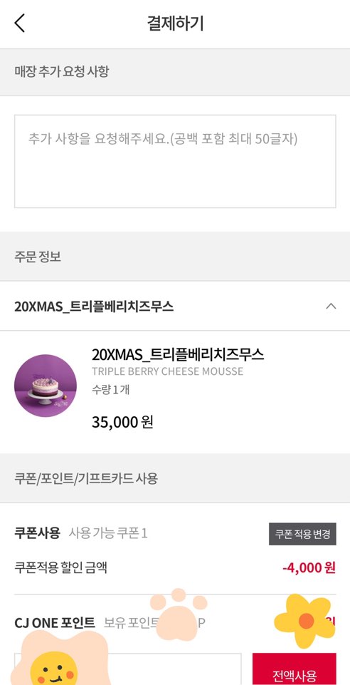 (6) 홀케이크 픽업 날짜 및 시간, 연락처, 요청사항 등을 빈칸에 내용을 적습니다. 홀케이크를 결제하기 전에 4,000원 할인 쿠폰을 선택하여 적용한다. 그리고 나서 하단에 내용을 확인했고 주문/결제에 동의한다는 체크박스를 체크한 후에 결제진행하면 됩니다. 결제 진행하기 전에 매장에 주문해도 되는지 물어보는 것도 좋을 것 같습니다.