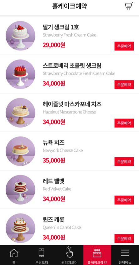 (5) 홀케이크예약 메뉴에서 케이크를 픽업할 가까운 매장이나 선택하고 싶은 매장주소를 확인한 후 매장을 선택합니다. 그러면 화면을 밑으로 내리시다보면 홀케이크 메뉴들이 확인되실 것입니다. 원하는 케이크에 주문예약을 버튼을 누릅니다. 주문하는 페이지가 뜨고 장바구니 담기 또는 바로 주문하기를 클릭합니다.