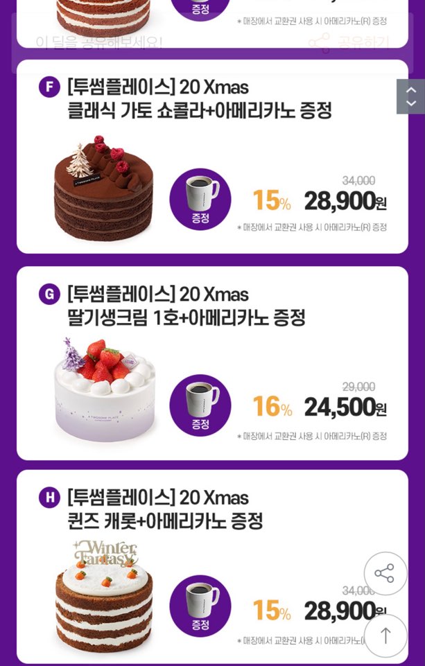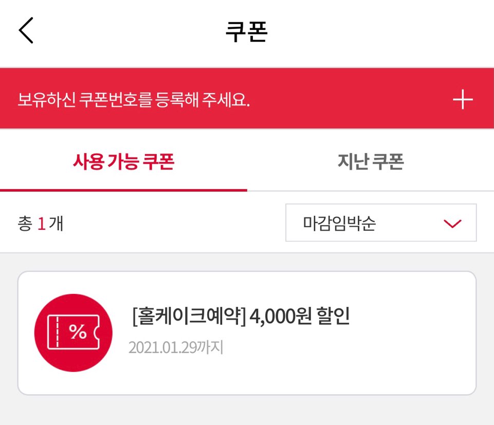 - 또는 티몬 앱에서 홀케이크 쿠폰을 최대 16% 할인하고 있습니다. 워낙 많은 사람이 구입하고 있다 보니 원하는 메뉴는 품절이 되어서 저는 티몬에서 할인받아 구매하지는 않았습니다. 티몬 앱에 들어가서 원하는 메뉴가 있으신지 파악해보시고 티켓 구입한 후에 매장에 문의한 후 예약하시는 방법을 사용해도 좋습니다.