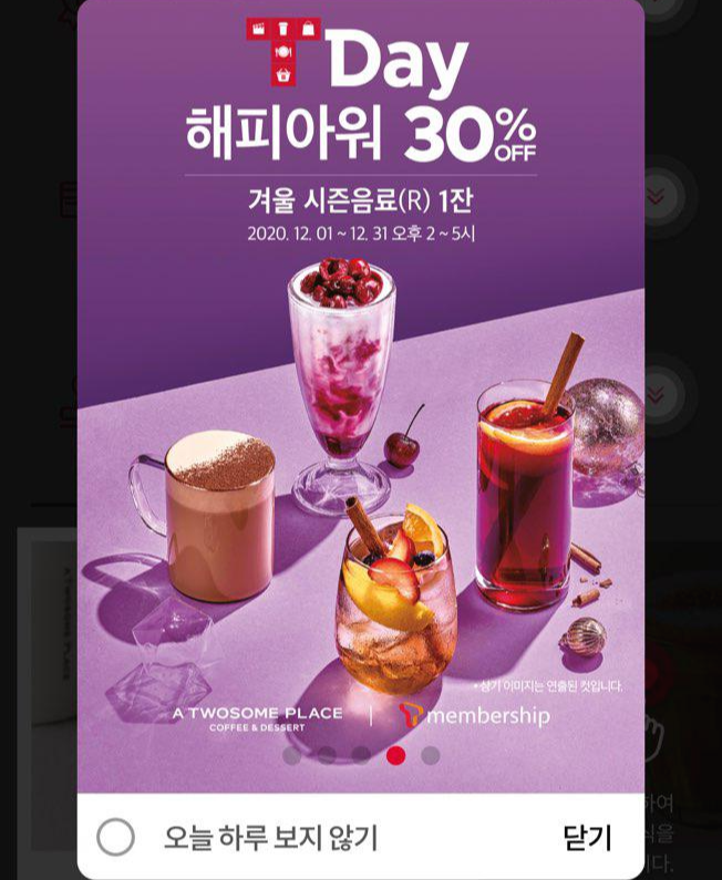 이벤트로 T데이 해피아워 시즌 음료 30% 할인도 있다고 합니다. 모바일앱에서 여러 이벤트를 구경하실 수 있습니다.