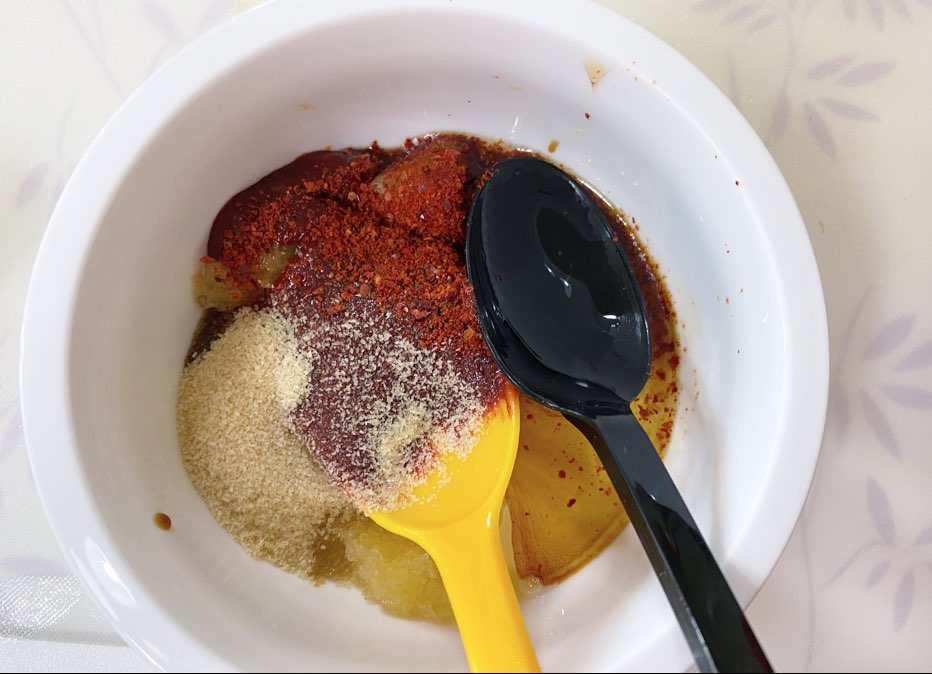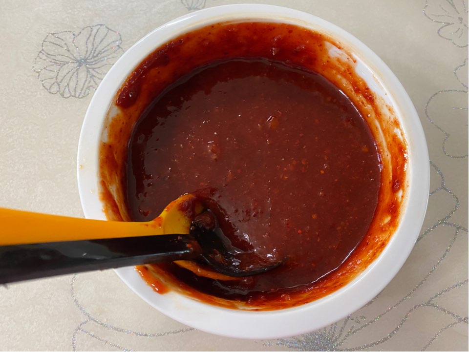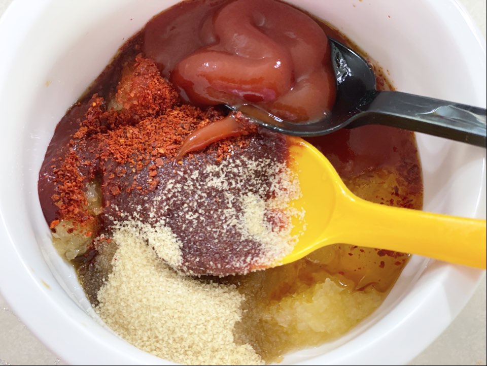 2. 그사이에 양념을 만들어 줍니다. 저는 거의 1:1 비율로 소스를 만들면서 케첩은 좀 더 많이 넣었던 것 같습니다. 고추장, 고춧가루, 케챱, 올리고당, 맛술, 간장, 다진 마늘 그리고 참고로 저는 설탕과 꿀도 조금 넣었습니다. 양념을 완성했습니다.