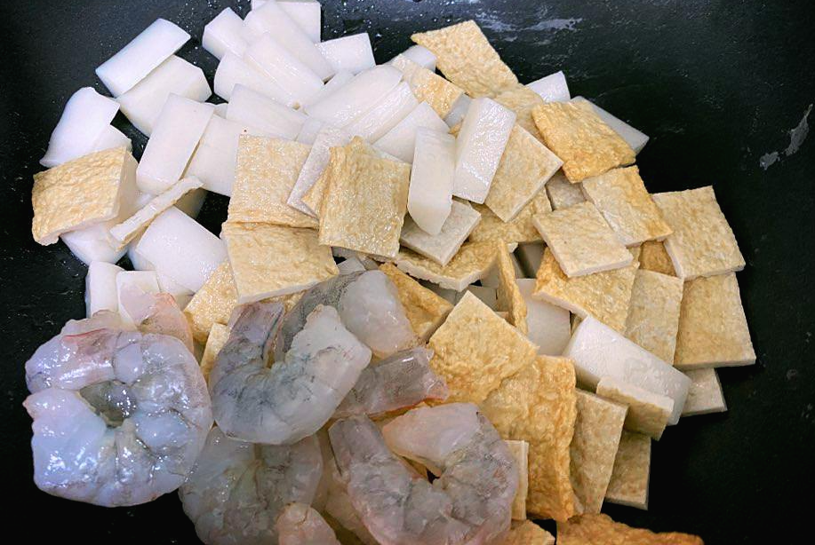 3. 프라이팬에 기름을 두른 후에 떡을 넣고 구워줍니다. 나머지 재료들도 넣어서 볶아줍니다. 저는 어묵과 새우를 넣어 사용했습니다.