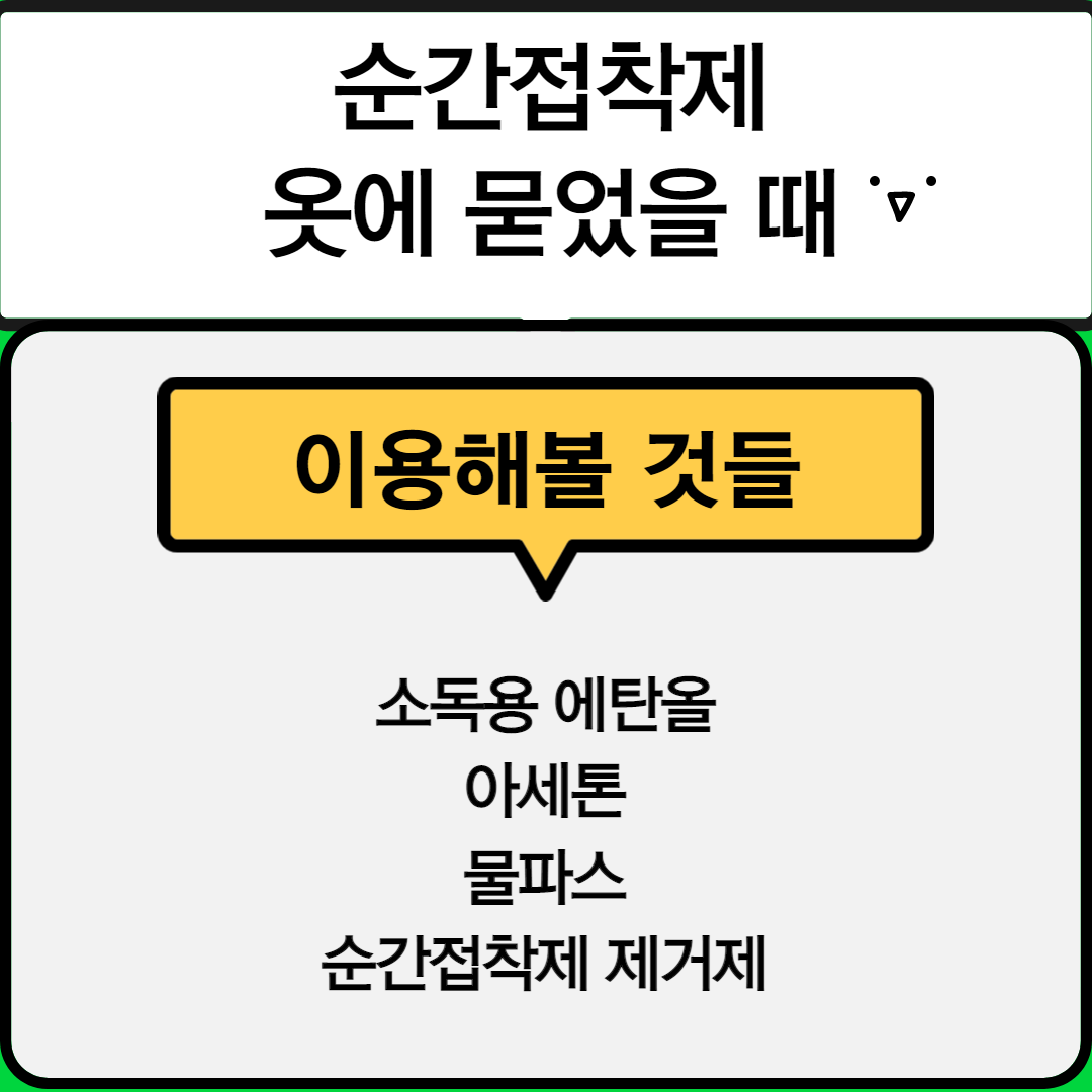 소독용 에탄올을 사용할 수 있으면 알코올보다는 낫다고 합니다. 옷에 에탄올을 살짝 부어주시고 면포, 천, 화장솜 등으로 빠르게 지워줍니다. 본드이기 때문에 한 번에 지워지지는 않고 여러 번 시도해주시면 됩니다.