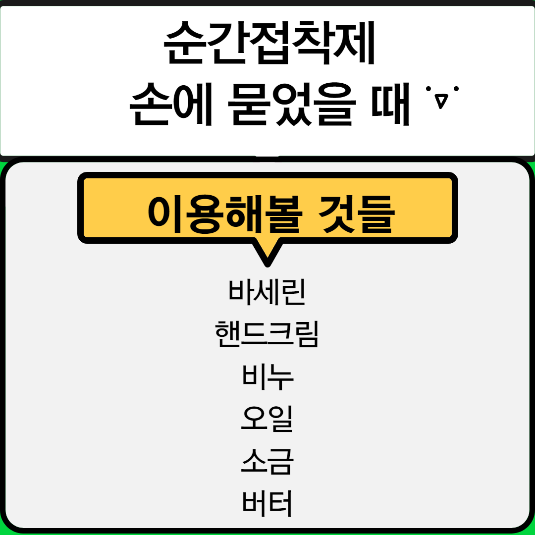 5. 피부에 묻은 순간접착제는 바세린, 핸드크림, 비누, 오일, 소금, 버터 등으로 문질러 접착제 묻는 부분을 약화시켜서 제거할 수 있다고 합니다. 기름 성분을 이용하는 것이라고 보면 될 것 같아요.