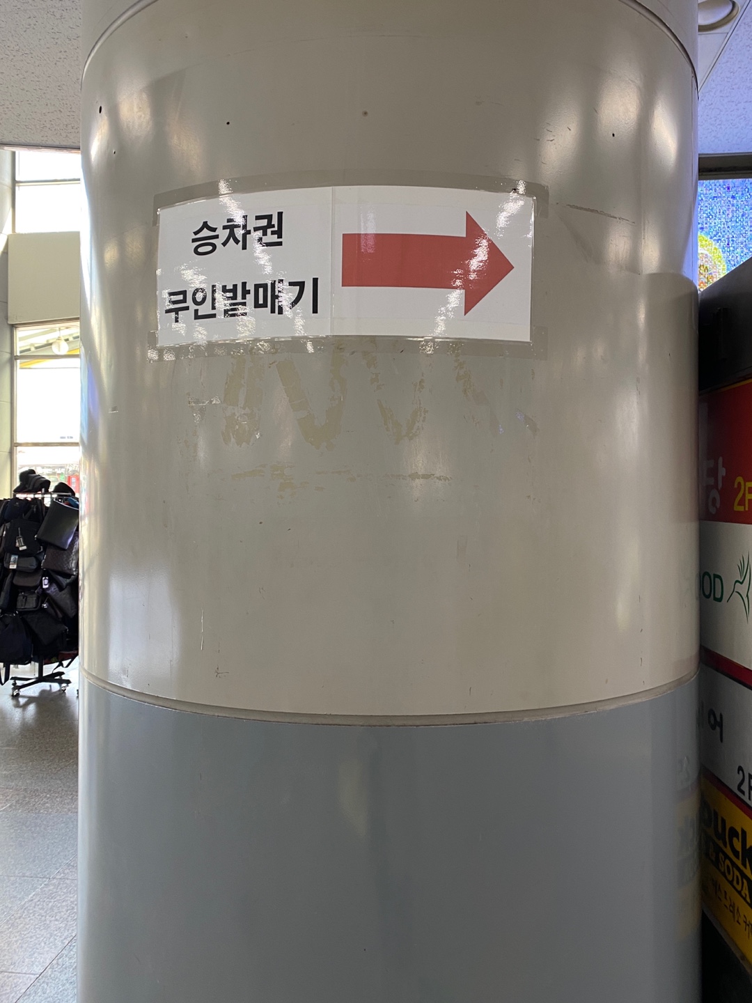승차권 무인발매기를 우측에 있습니다. 우측에 있는 창구에서 티켓을 발매하실 수 있어요.