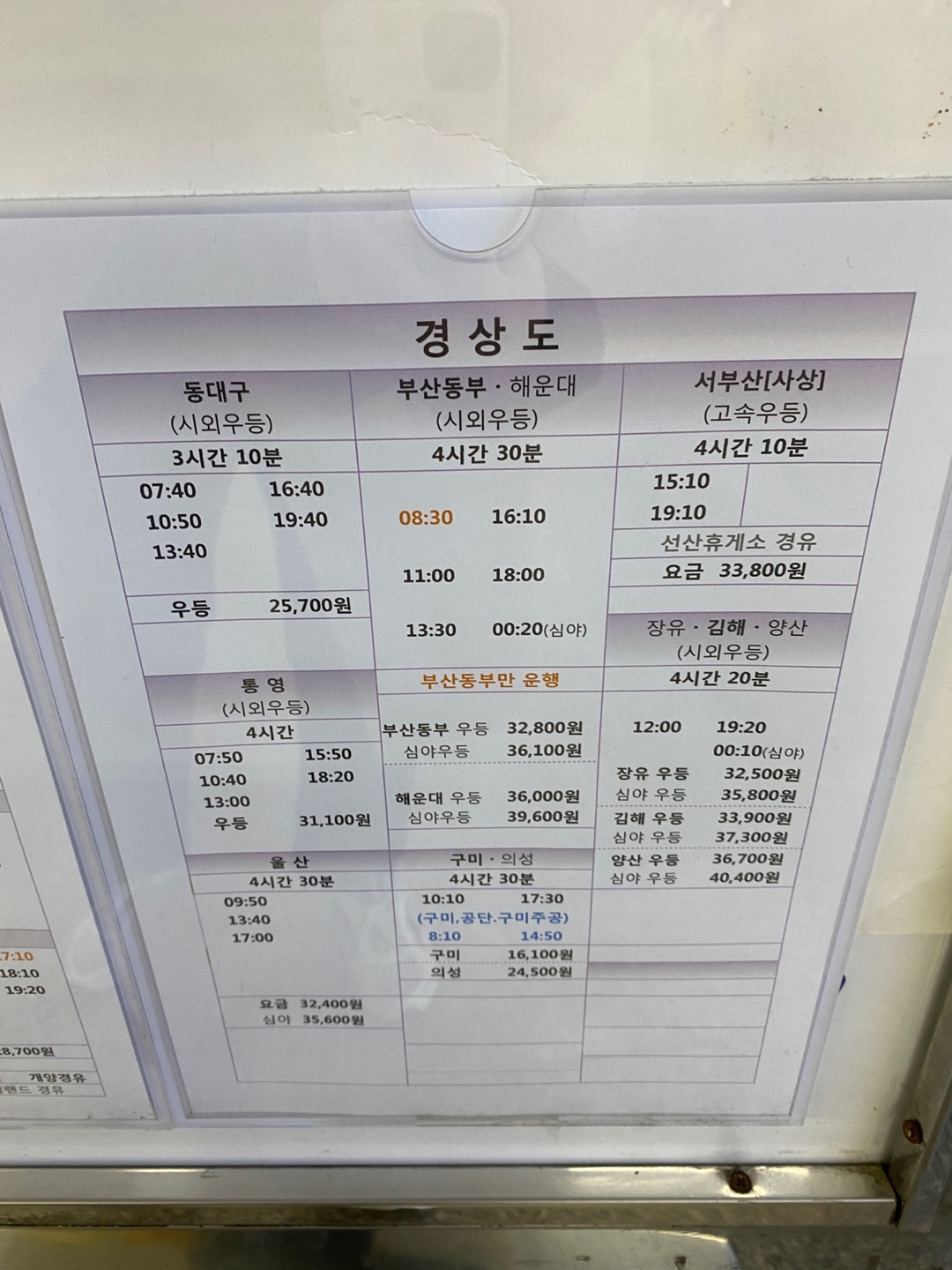 경상도 방면 : 마산, 창원, 경주, 포항, 진주 편 시간표와 요금입니다.