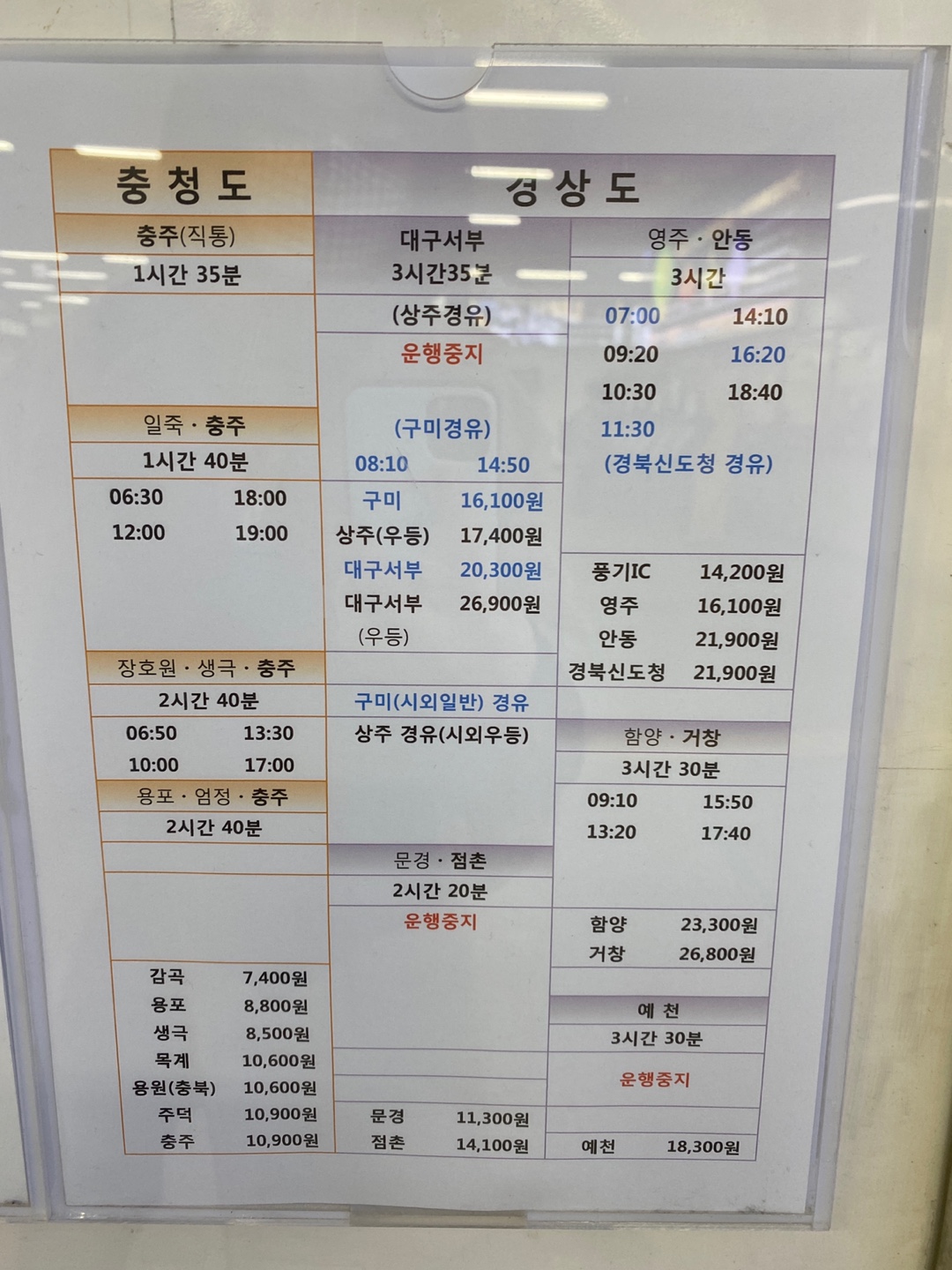 대구 서부, 문경, 점촌, 영주, 안동, 함양, 거창, 예천 시간표와 요금도 참고하시기 바랍니다.