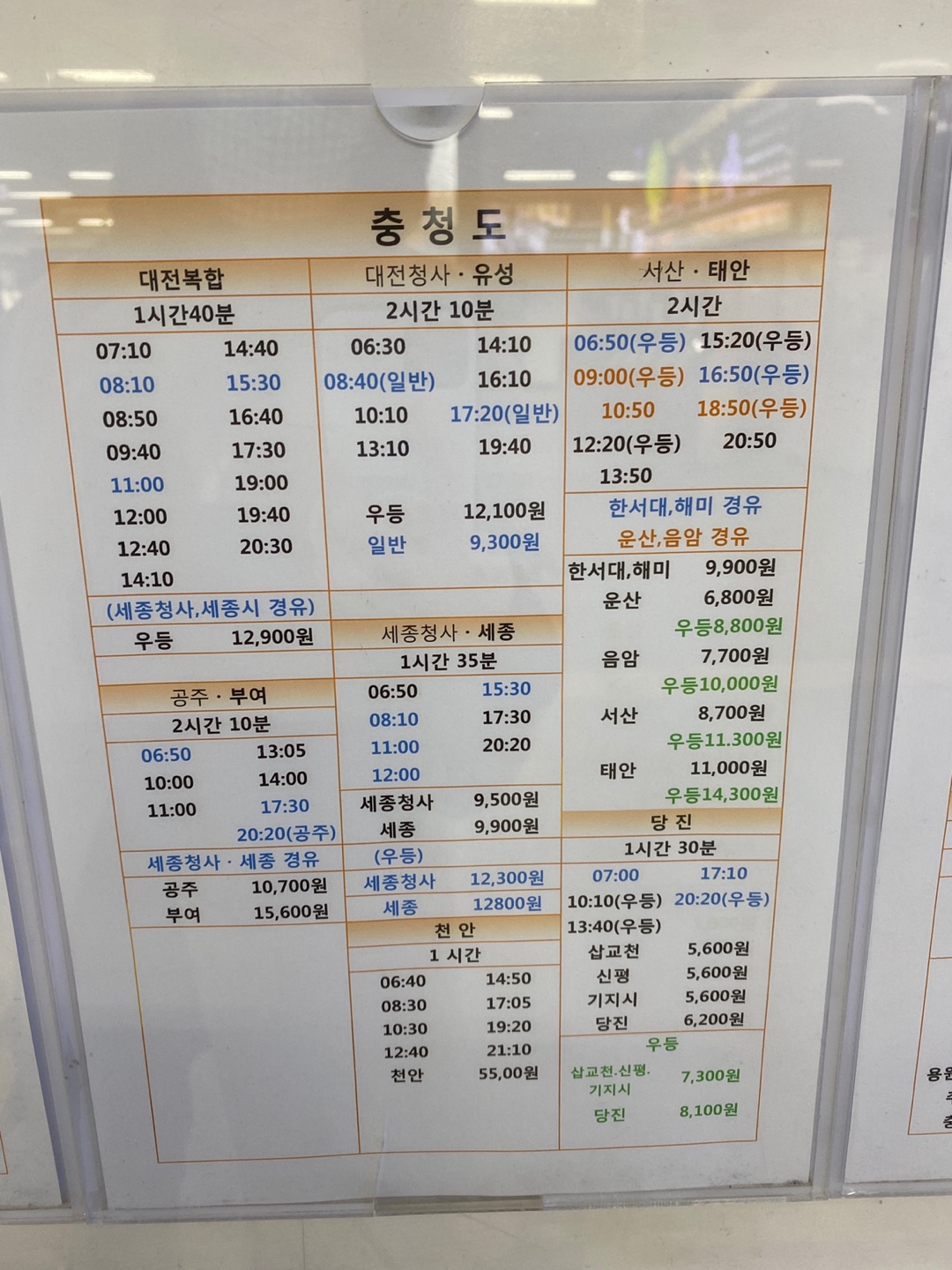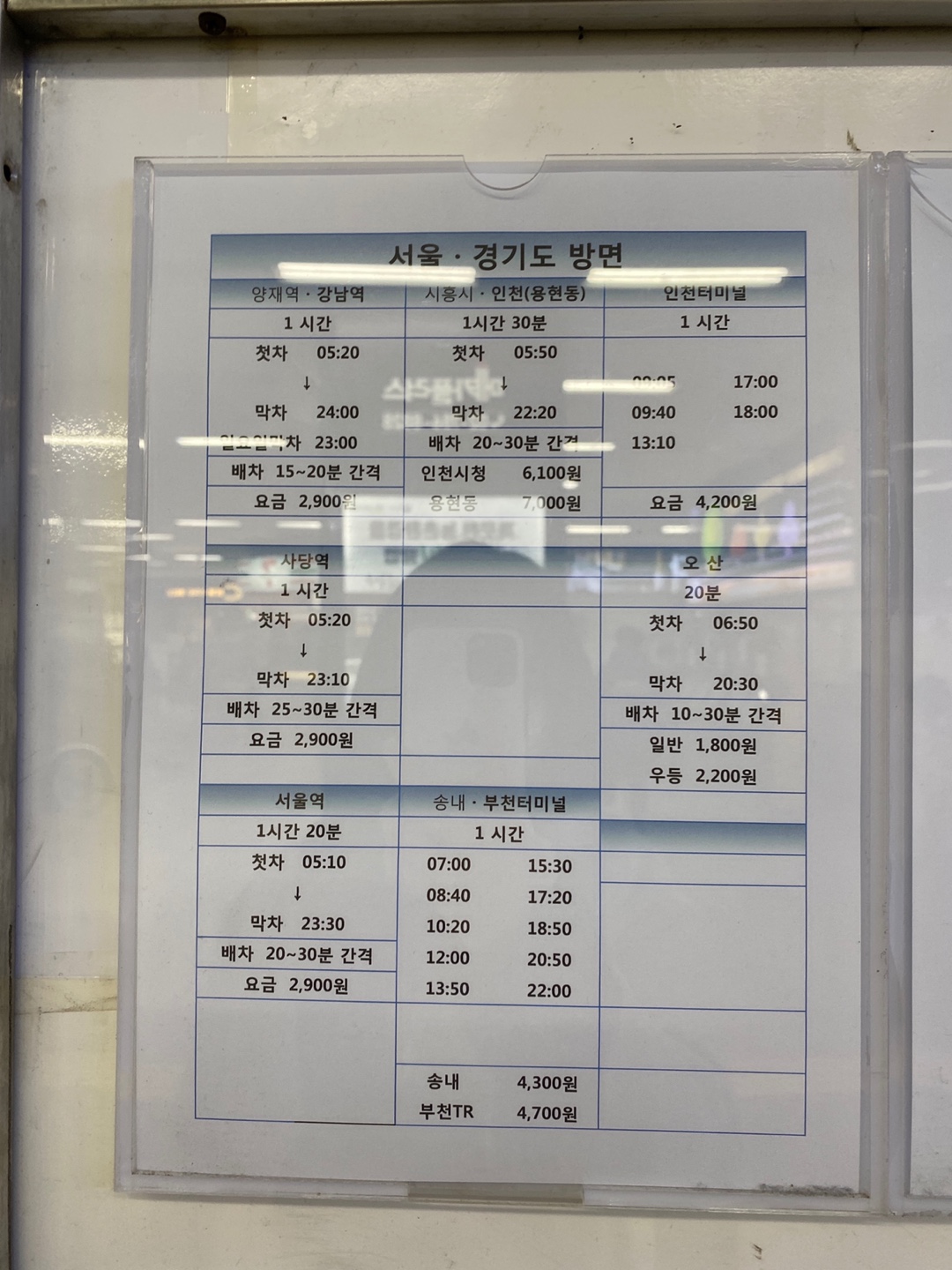 이제 중요한 수원터미널의 시간표, 요금표를 살펴보겠습니다.