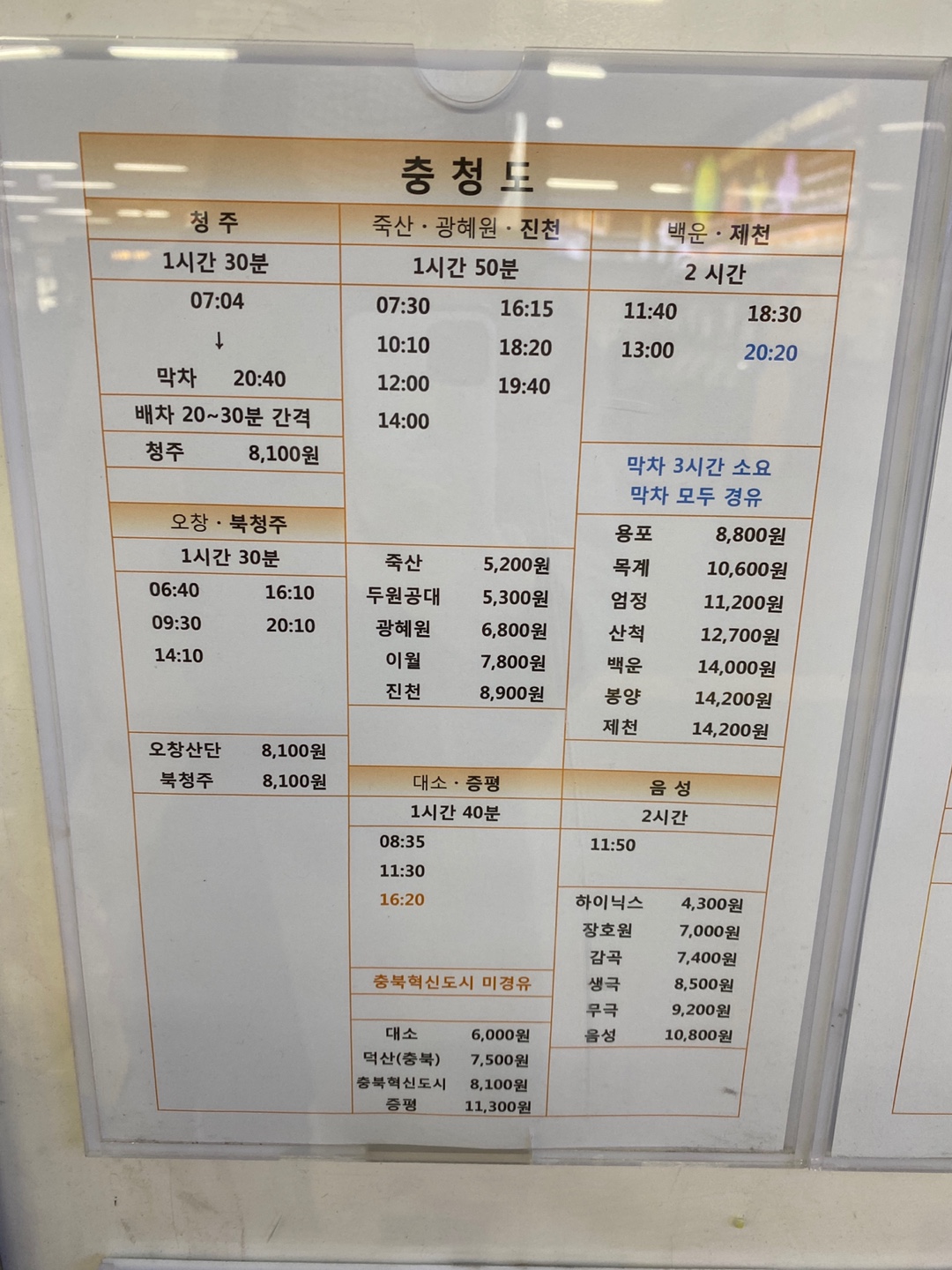 청주, 죽산, 광혜원, 진천, 백운, 제천, 오창, 북청주, 대소, 증평, 음성 가는 시간과 요금표입니다.
